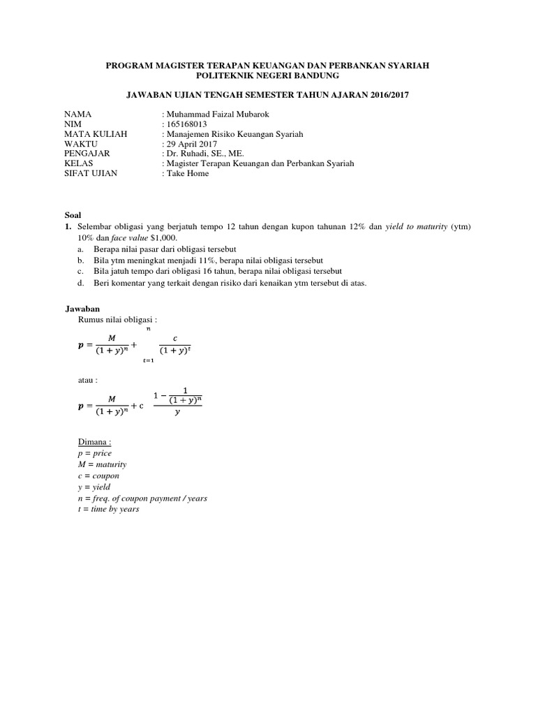 Soal ujian ut universitas terbuka manajemen eksi4203 teori portofolio dan analisis investasi lengkap dengan kunci jawaban kami share untuk anda mahasiswa universitas terbuka non pendas fekon fakultas ekonomi yang sekarang ini sedang menempuh pendidikan pada semester 5. Contoh soal yield to maturity. Soal bab 6 tingkat suku bunga dan penilaian obligasi bab 6.
