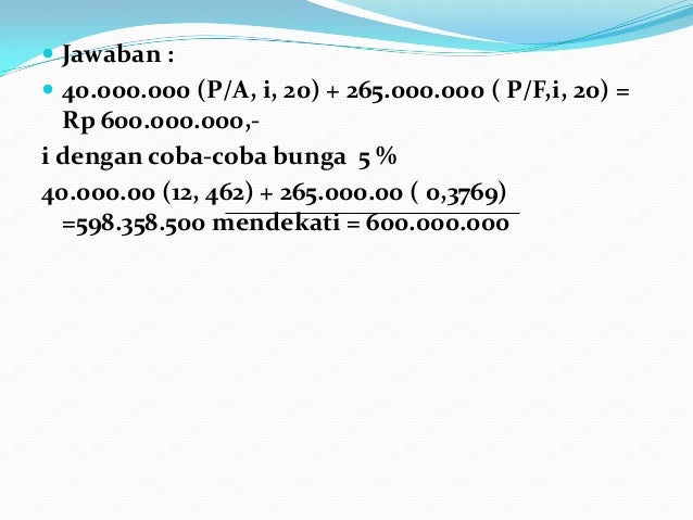 Disamping itu untuk mengoperasikan investasi tersebut dibutuhkan biaya operasi rata rata 10 juta rupiahtahun selanjutnya dari hasil penjualan produk diperkirakan akan ada pemasukan rata rata 30 juta rupiahtahun. Sesuai dengan judul diatas disini aku akan berikan contoh soal beserta jawabannya silahkan disimak. Inilah contoh soal uts ekonomi teknik.