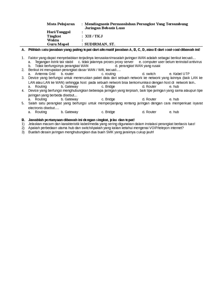 Mendiagnosis permasalahan perangkat yang tersambung jaringan berbasis luas wan merupakan modul teori dan atau praktikum yang membahas dasar dasar mendiagnosis permasalahan perangkat yang tersambung jaringan berbasis luas. Home soal produktif tkj 30 soal instalasi perangkat jaringan berbasis luas lan wan. 30 soal instalasi perangkat jaringan berbasis luas lan wan.